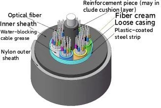 ② يتم ملء الجزء الخارجي من أجزاء التقوية والداخل من قلب الكابل بمعجون كابل مانع لتسرب المياه، مما يضمن تأثيرات مقاومة الرطوبة ومنع تسرب المياه للكابل الضوئي.