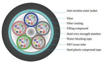كابل بصري خارجي للاتصالات بغلاف مربوط من الفولاذ/الألومنيوم والبولي إيثيلين مع مادة مضادة للقوارض