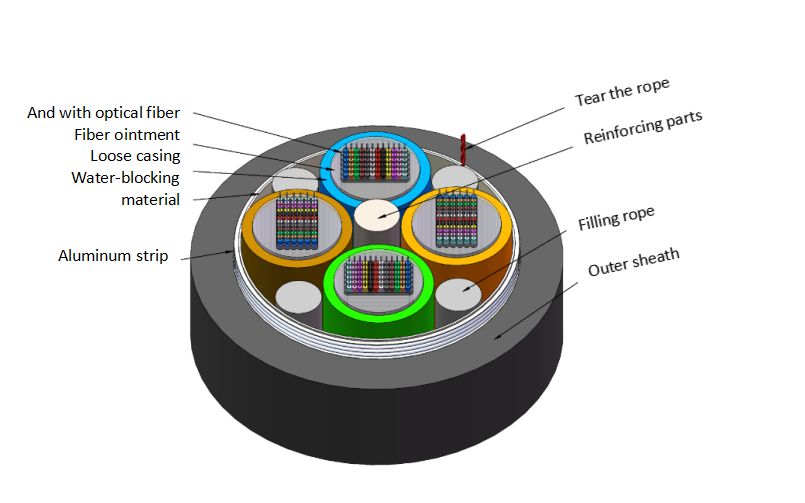 هيكل الكابل الضوئي هو إدخال شريط الألياف الضوئية من وضع واحد أو متعدد الأوضاع في أنبوب فضفاض مصنوع من بلاستيك عالي النمط ومليء بالمركب المقاوم للماء.مركز قلب الكابل هو جزء تعزيز المعدنيةبالنسبة لبعض الكابلات البصرية مع أرقام قلب معينة ، يتم طحن طبقة من البولي إيثيلين بالخارج من الجزء المركزي المعدني المعزز.أنابيب فضفاضة (وحبال ملء) تلتوي حول العنصر المركزي تعزيز لتشكيل محور الكابل المدمجة والدوريةيتم ملء الفراغات الداخلية من قلب الكابل بمركب منع المياه ، ويتم طحن غطاء من الألومنيوم البولي إيثيلين المرتبط بالخارج لتشكيل الكابل.